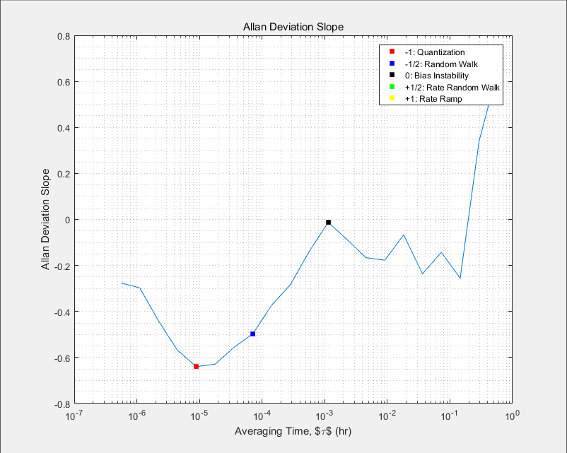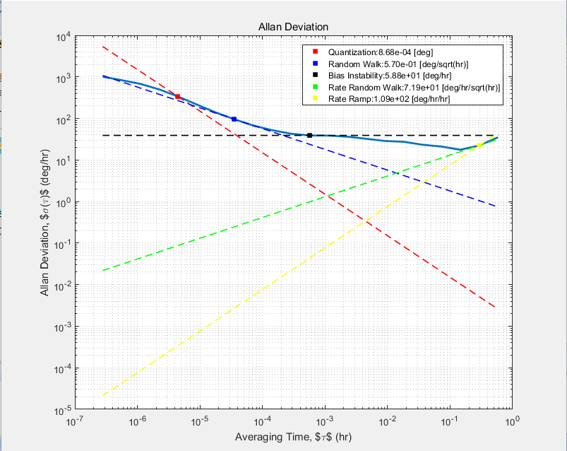 | 角度随机游走(ARW) | $S_{\varOmega}(f) = N^2$ | $\log_{10} \sigma_{\tiny{ARW}}(\tau) = \log_{10}N - \frac{1}{2}\log_{10}\tau$ | $-\frac{1}{2}$ | $(1,N)$ |