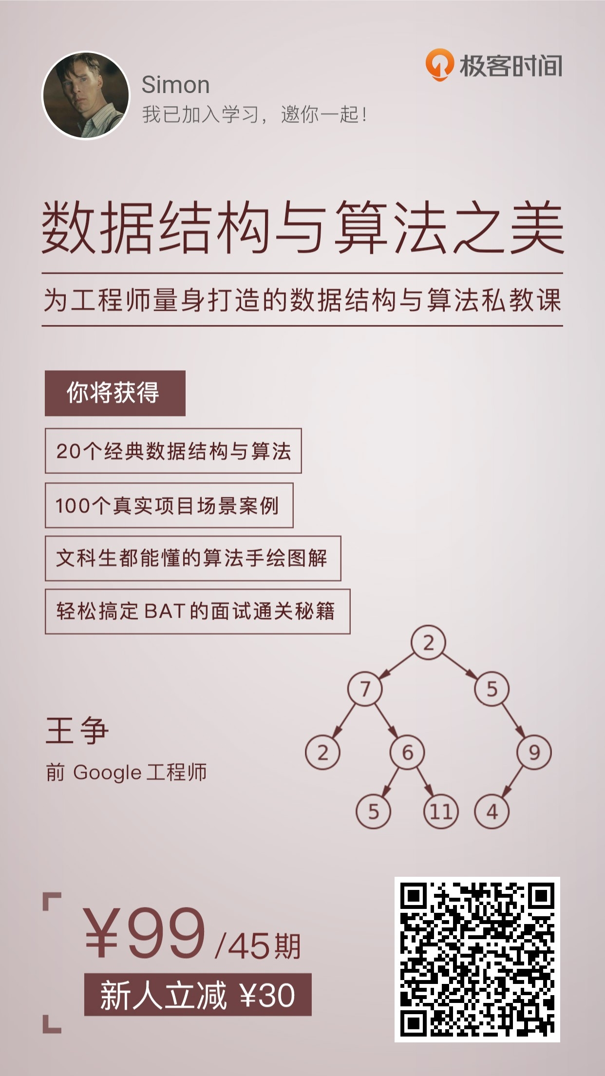 极客时间《数据结构与算法之美》课程链接,扫描二维码即可。