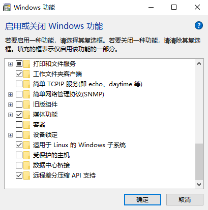 点击:启用或关闭 Windows 功能,然后拉到最下方,找到“适用于 Linux 的 Windows 子系统” 一项,并在前面打勾,即开启了 WSL 功能