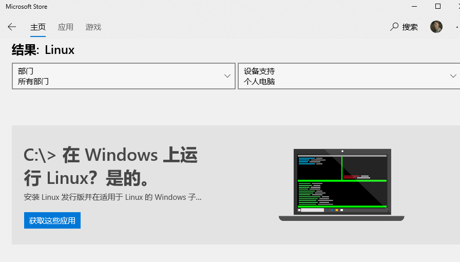 在搜索框输入“Linux”,搜索结果出现了 WSL 的介绍,点击 “获取这些应用” 。