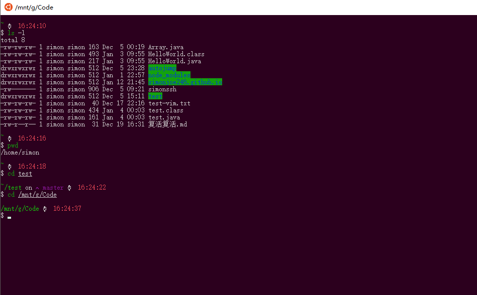 注意:这个 WSL 系统是可以访问 Windows 系统下的磁盘文件的(如上图访问了我的 G 盘),以后我们就可以在WIndows 上进行 C 和 Java 开发了,体验完全不同。